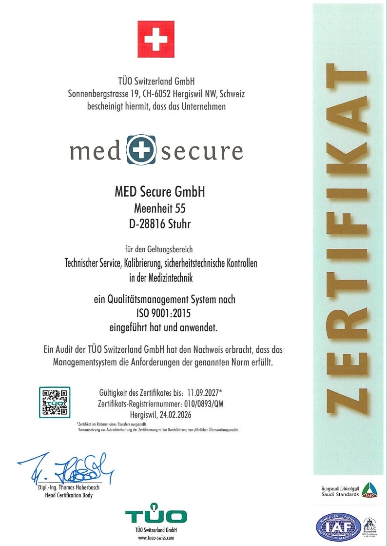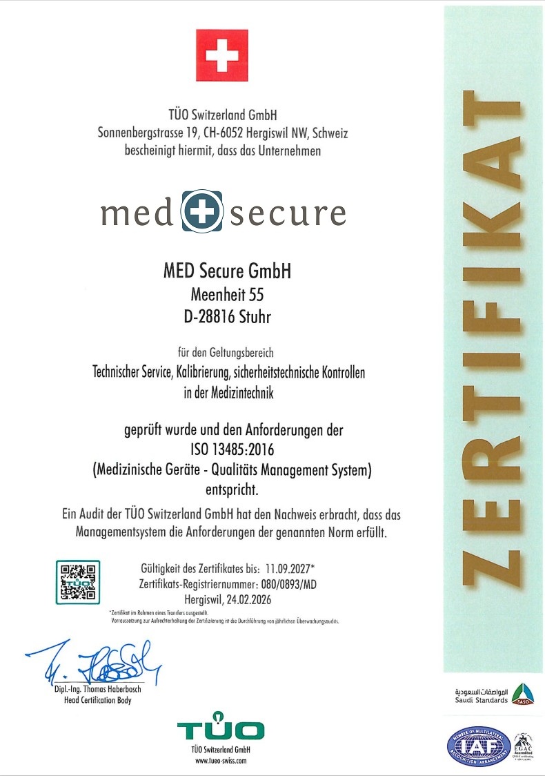 Zertifikate machen unsere hohen Qualitätsstandards für Kunden und Partner transparent und sind daher ein wichtiger Bestandteil unserer Firmenphilosophie. Die MED Secure besitzt ein zertifiziertes Qualitätsmanagementsystem für Medizinische Geräte nach DIN EN ISO 13485:2016 und ist zudem zertifizierter PHILIPS Service-Partner.